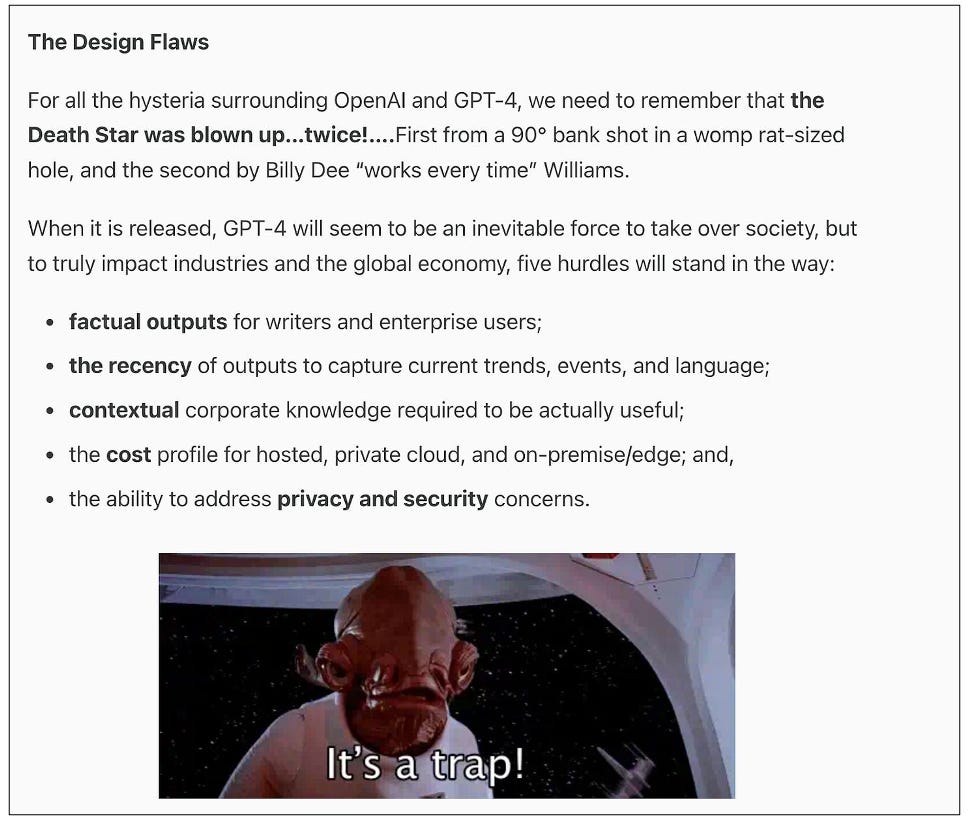 In January of 2023, I believed (and bet my company) on orchestration as the eventual winner over massive models, and my Death Star post signaled that. I then drafted but didn’t publish a piece called “He’s going Full Palpatine.” The follow-on post was a nod to Episode IX (ugh) — with fleets of Star Destroyers with fully operational Death Star killing capabilities, just in a smaller, focused form factor. Way more effective than a single massive planet killer.