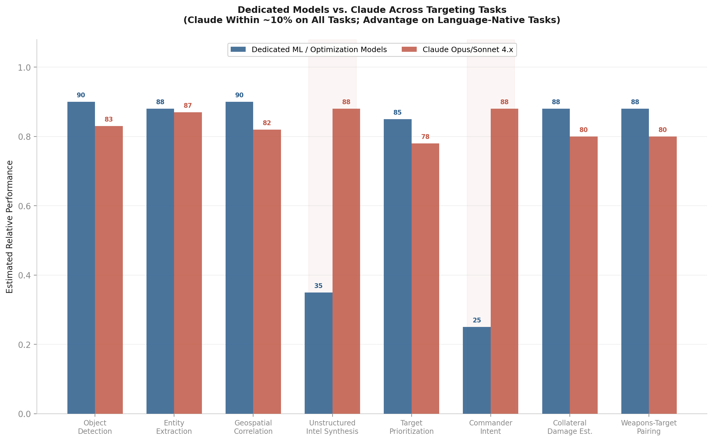 Identify entities. Pre-LLM: roughly 80-85%. LLM increment: 4-7 points. Published named entity recognition (NER) benchmarks show traditional NLP models (Bidirectional Encoder Representations from Transformers, or BERT) tuned for targeting use cases and frontier LLMs are closer than commonly assumed: BERT at F1 88-92% versus Claude at an estimated 87-95% depending on domain and prompting strategy. Claude’s current generation models (Opus 4.6 and Sonnet 4.6) outperform GPT-4o by 5-15% on reasoning benchmarks, meaning the NER figures from GPT-4 benchmarks likely understate Claude’s performance. For standard entity types, Claude and fine-tuned BERT are likely within 1-3 points of each other. Claude edges ahead on complex relational extraction and novel entity types. For object identification in imagery, the accuracy gap is narrower than the speed gap; frontier vision-language models (VLMs) can identify military objects but cannot match dedicated detectors on throughput. Throughput increment: potentially 2x on document-heavy identification.