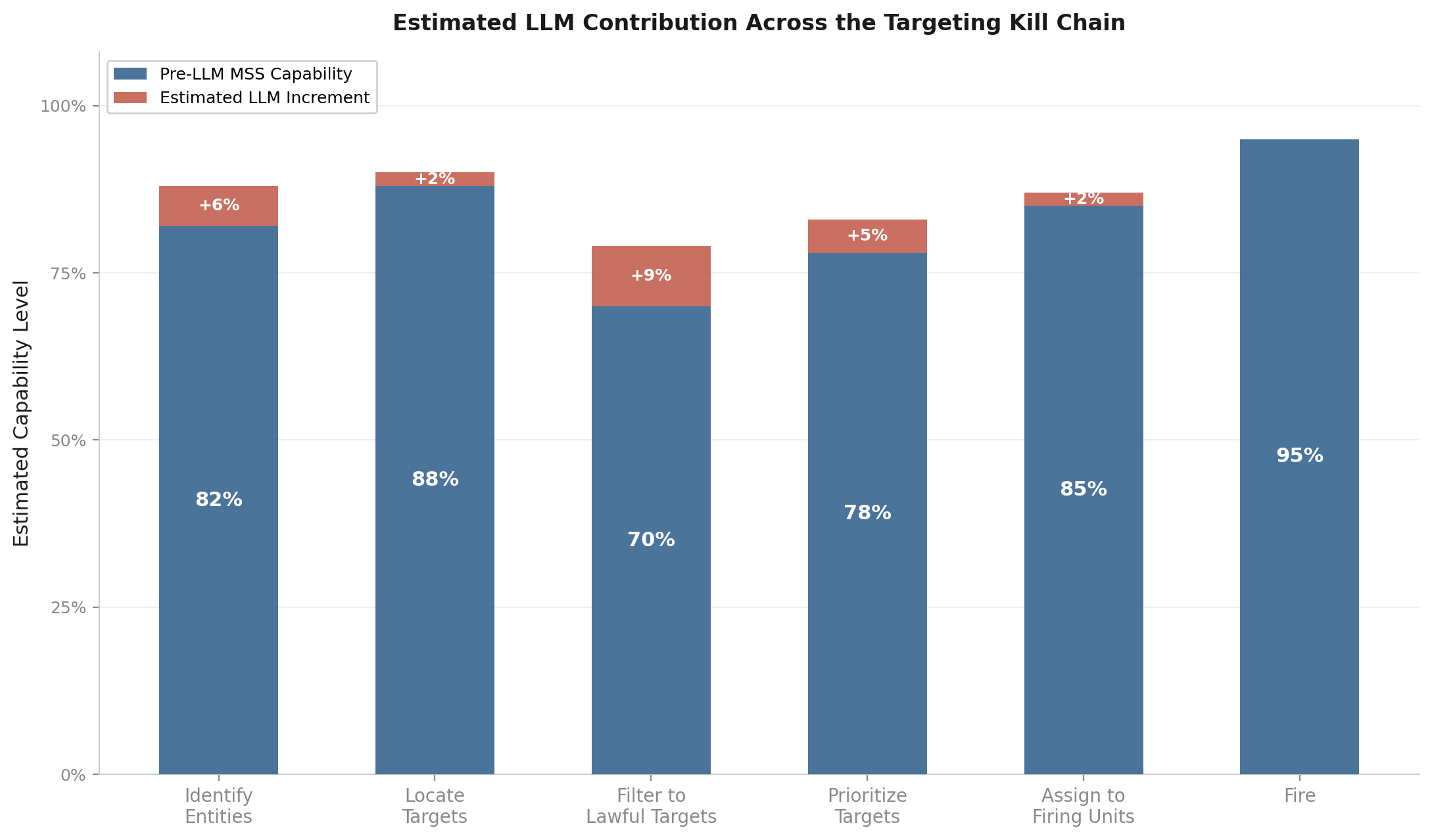 Estimated LLM contribution across the six-step targeting kill chain. Author’s estimates assuming mature pre-LLM systems.