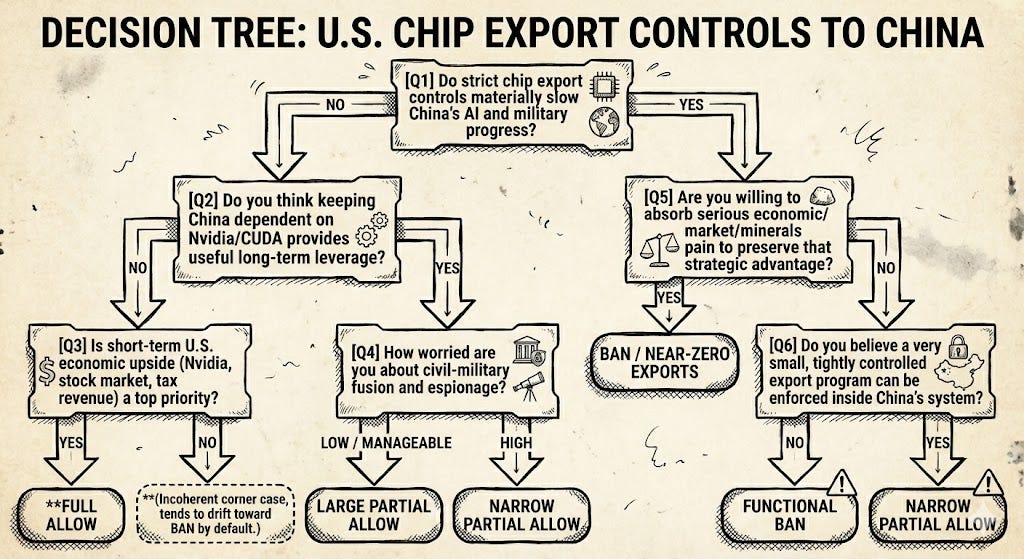 The goal here is to do two things. First, organize the main arguments for and against giving China access to H200‑class chips. Second, unpack the beliefs you’d have to hold to land on “full allow,” “partial allow,” or “ban,” and turn that into a simple decision tree. Here’s a rough preview of the decision tree: